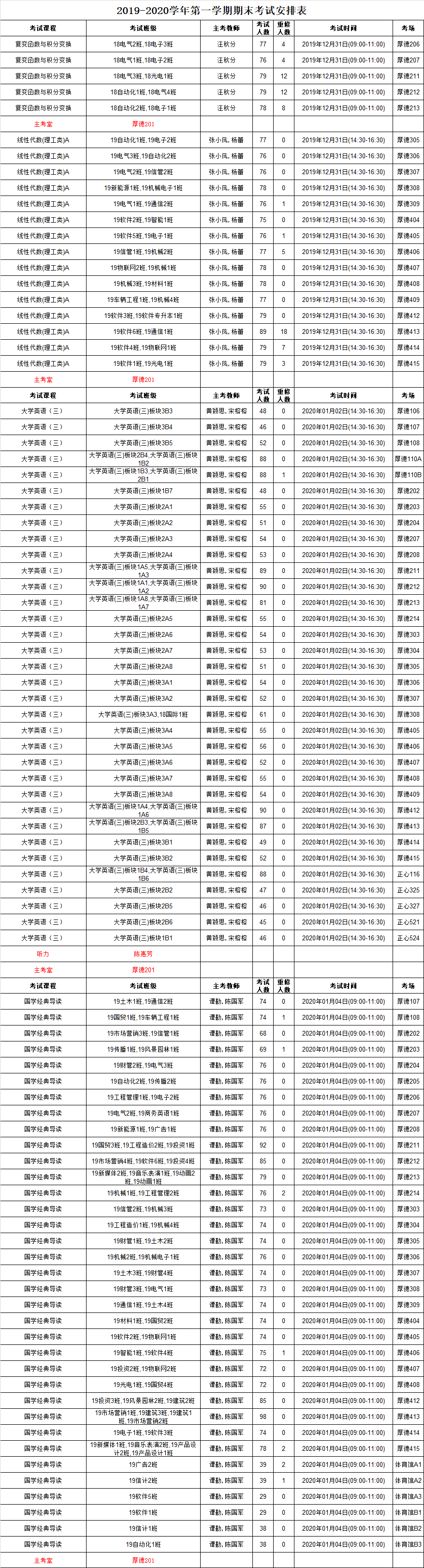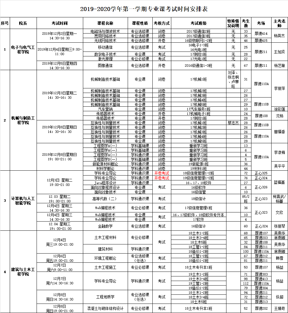 2019-2020学年第一学期第十九周专业课考试时间安排表