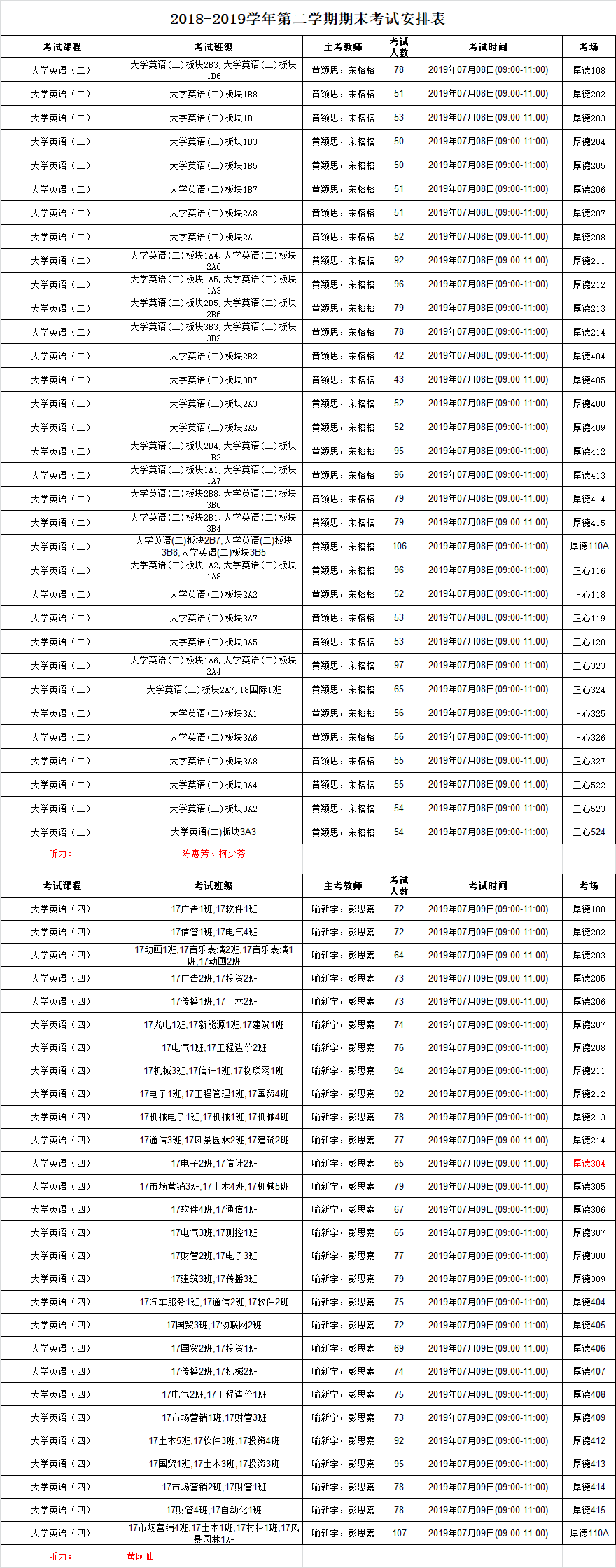 2018-2019学年第二学期第十九周公共课考试安排