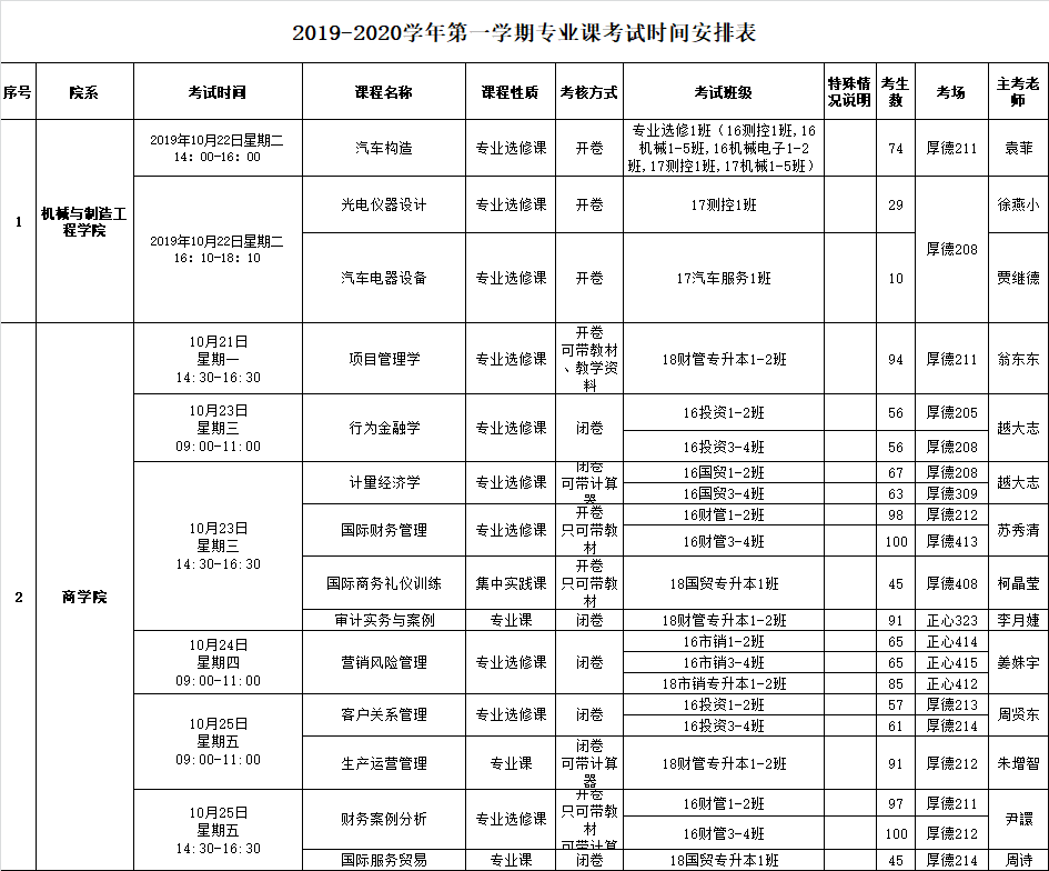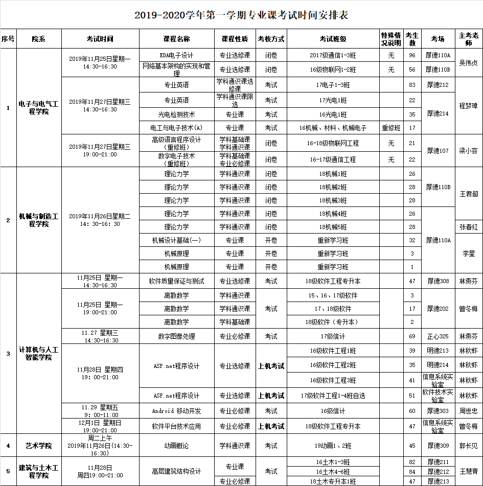 2019-2020学年第一学期期初重新学习(补考)专业课考试安排