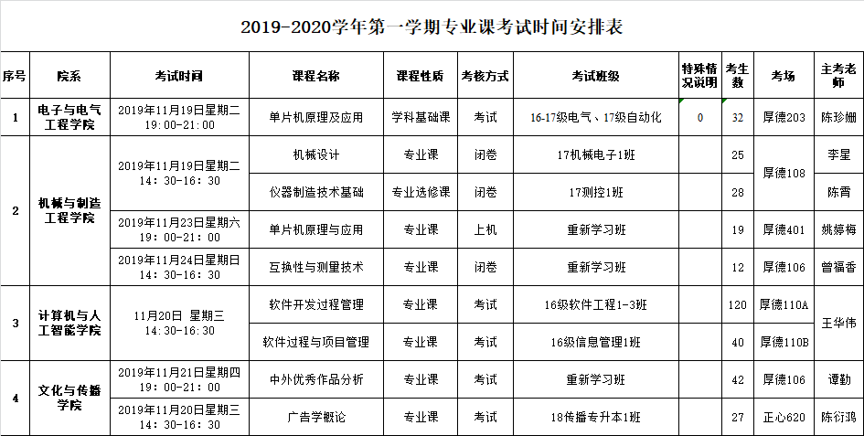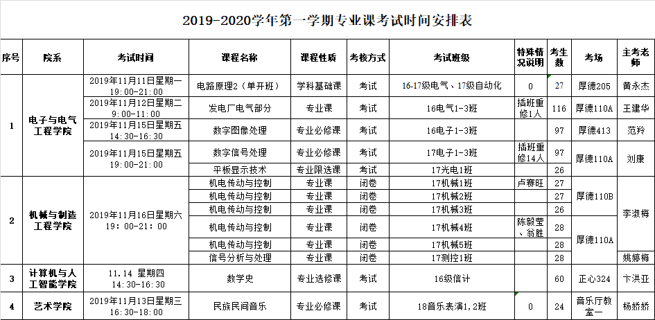 2019-2020学年第一学期第十一周专业课考试时间安排表