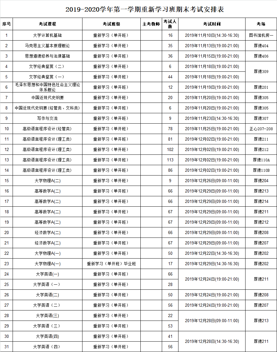 2019-2020学年第一学期期末公共课(重新学习班)期末考试安排
