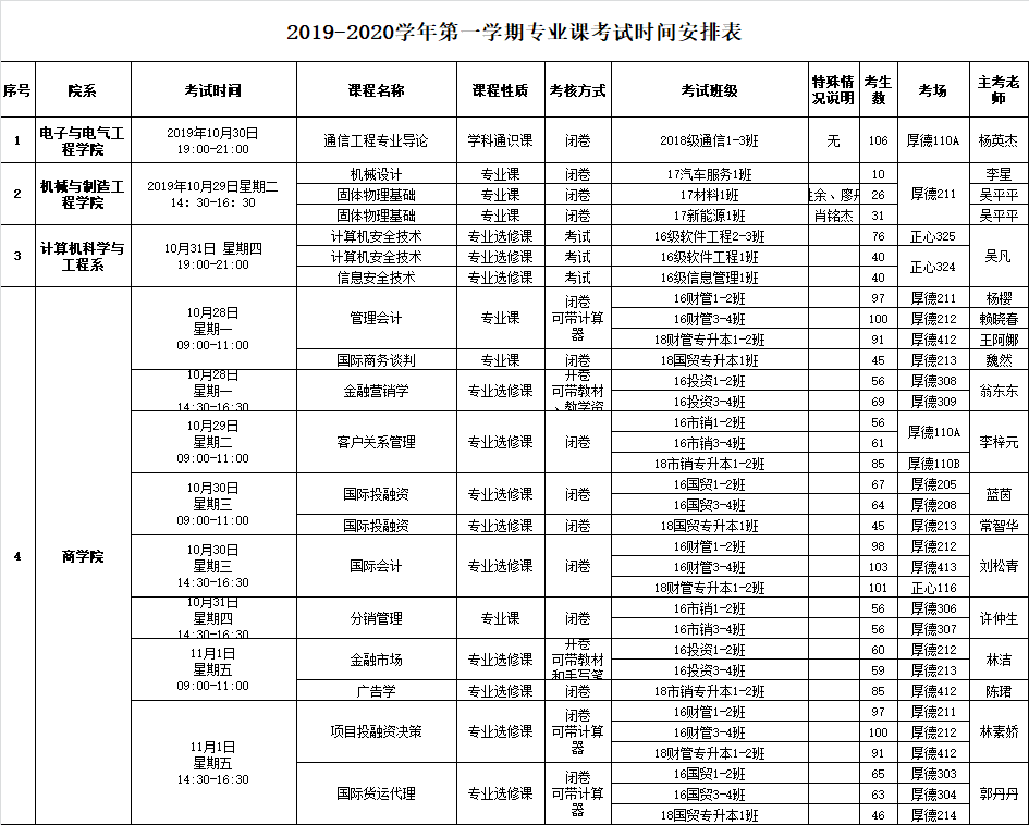2019-2020学年第一学期第九周专业课考试时间安排表