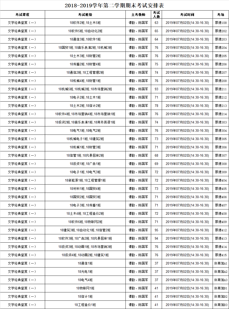 2018-2019学年第二学期第十七周专业课考试时间安排表-持续更新