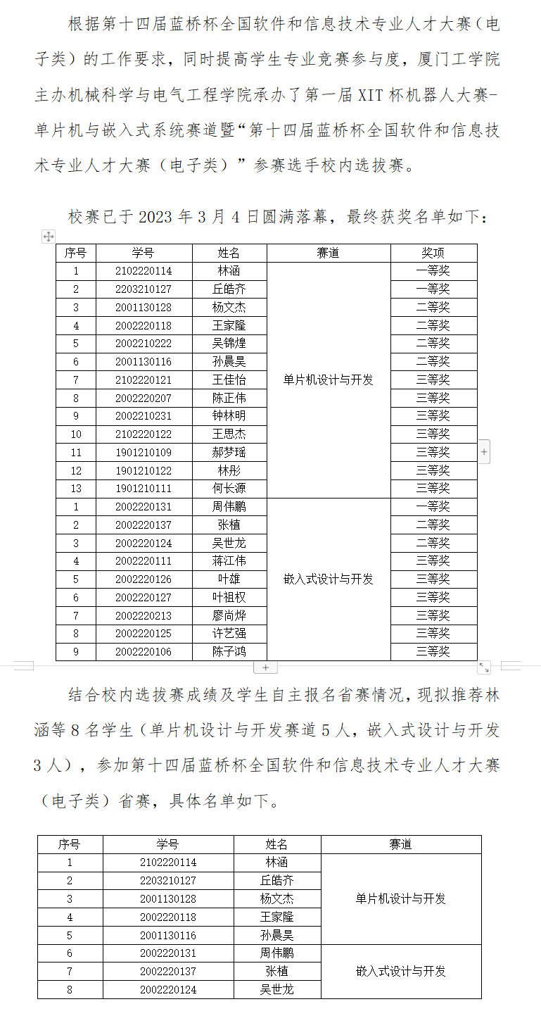 关于公布第一届XIT杯机器人大赛-单片机与嵌入式系统赛道
