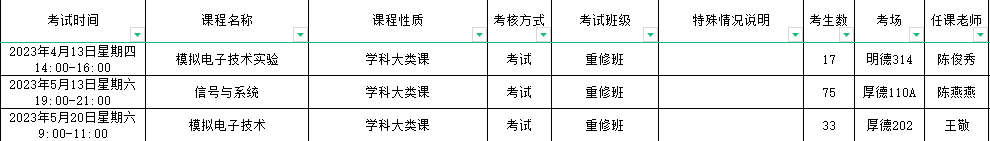 同学们: 本学期专业课期末考试(第9-19周已全部更新完毕)安排如下,红色标记的课程考试时间地点有所调整,请各位同学们注意。如若有问题可至明德503咨询或者拨打6667570咨询,请同学们好好复习,做好考前准备,严格遵守考场纪律,预祝同学们考试顺利,取得好成绩。