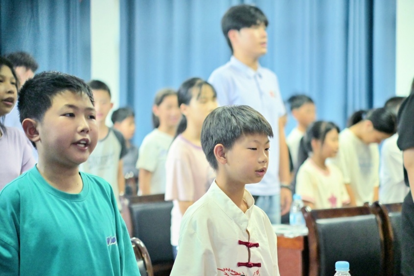 最后,全体师生起立,共同奏唱《中国少年先锋队队歌》。嘹亮的歌声在尚寨村中久久回荡,厦门工学院赴尚寨小学暑期 “三下乡” 社会实践活动由此拉开帷幕。