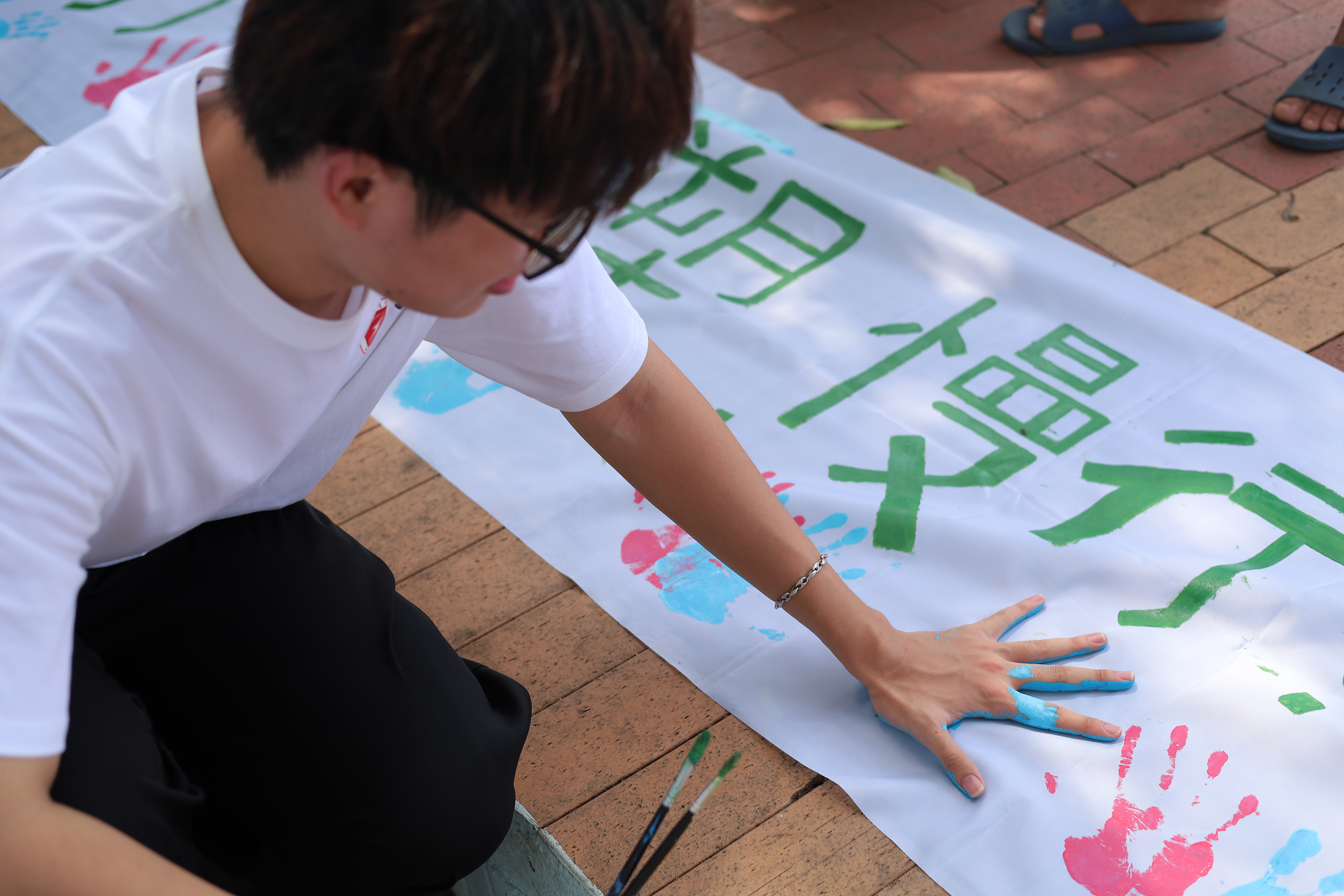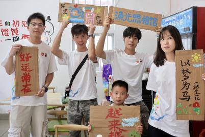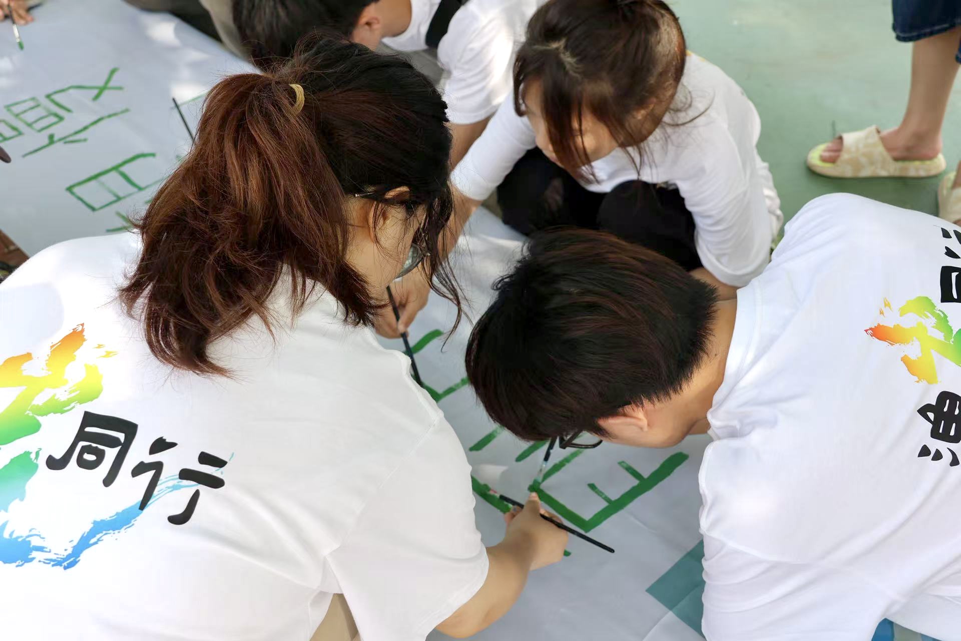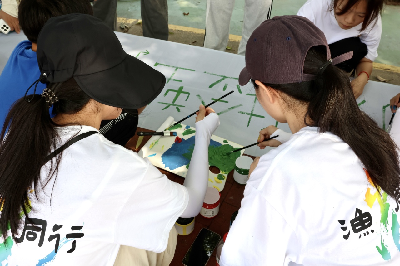 清晨的村委大院里,“渔光同行”实践队员们围坐在一起,铺开空白横幅共同创作。实践队队长卢陈涛写下“前方捡塑慢行!”的标语,其他实践队员一起为画作增添固色,展现的是对海洋保护的实在态度,响应了习近平总书记“做好‘海’的文章” 的嘱托,用实际行动践行绿色使命的集体承诺。创作收尾时,队员们纷纷蘸取红色、蓝色颜料,在横幅上按下自己的手印,如同青春力量凝聚成的环保誓言。