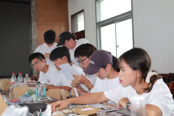“捡塑慢行”结束后,“渔光同行”实践队员们回到了村委会议室,这里成了 “旧塑焕新” 的创意工坊。黄珺琳、郑琳、郑佳颖带领大家把上午收集的贝壳、回收塑料材料利用起来:用黏土捏出圆形、长方形等形状,在粘上做成景致的冰箱贴;在鲍鱼壳上绘上沙滩、海浪轮廓做成冰箱贴;把剪瓷雕的碎瓷片拼出陶瓷瓶模样;将贝壳雕成各种形状——这些带着海味的小物件,藏着渔村的日月与潮汐。