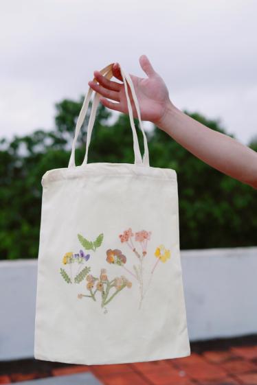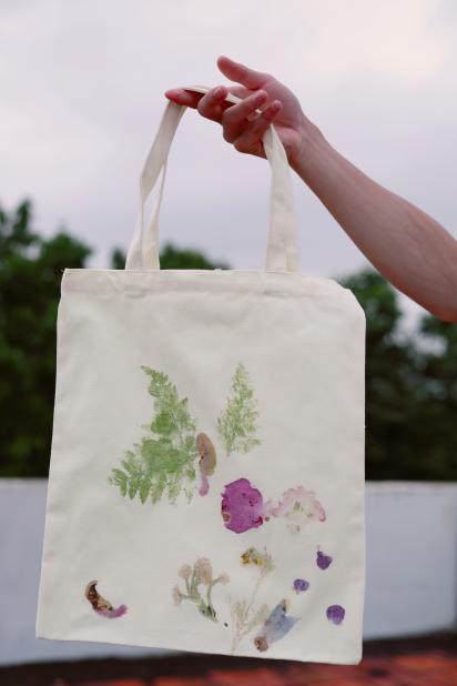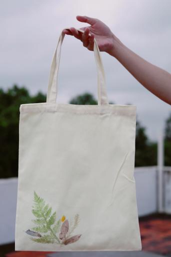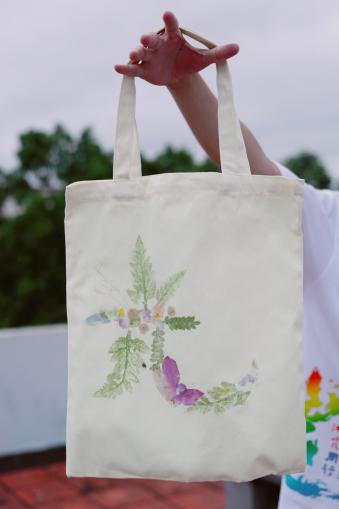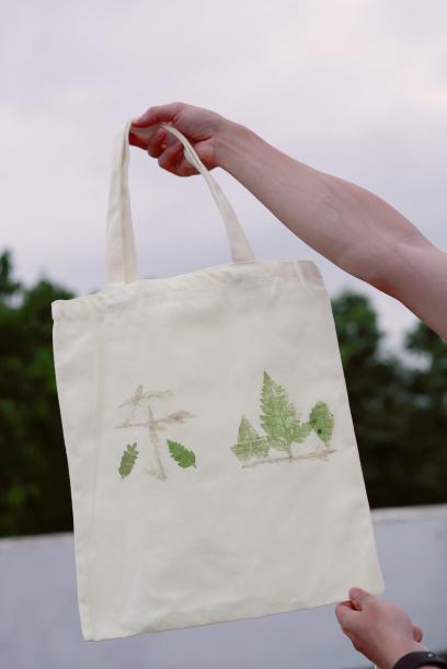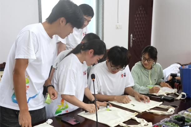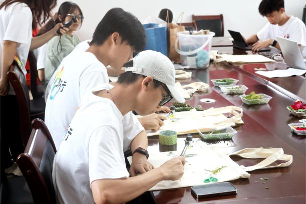 实践队员们化身“自然艺术家”,外出采集进行植物拓印,"以锤为笔,以花草为墨,在帆布袋上拓写渔村的自然诗行。敲敲打打间,植物的生命力在布面上绽放,其他实践队员们在黏土上绘绿植。每一份作品都承载着澳角渔港独特的自然记忆。