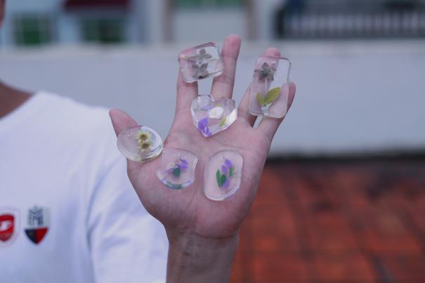 在潮汐往复的澳角渔港村部,实践队员以透明树脂为画布——将海滩边拾回的贝壳、礁石缝里的海螺碎片,连同岸上倔强生长的花草绿植,统统封存进树脂中。阳光穿透时,凝固的海螺花草在滴胶里绽放新生,折射出澳角渔村最动人的光谱。