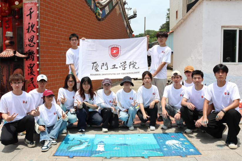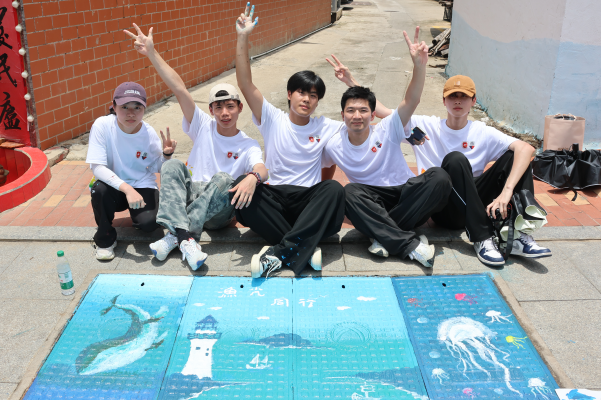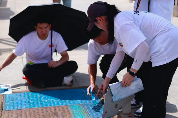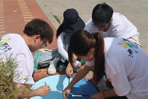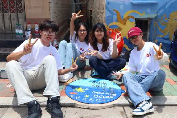 “植物滴胶”完成后。黄珺琳,郑琳,郑佳颖带领大家执彩笔俯身巷陌,将海洋生态、渔村文化融入街头巷尾,让平凡的井盖变身成渔村的“艺术名片”。丙烯颜料在阳光下闪烁,原本灰暗的井盖逐渐“活”了起来——跃动的鱼、南屿灯塔、归航的渔船,每一幅画都在诉说澳角海洋与渔村的故事。