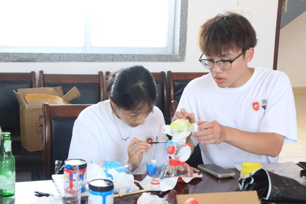 “旧塑换蔬”结束后,“渔光同行”实践队员们回到实践基地,将换来的回收物变身为“旧塑焕新”的创意素材,转眼这里成了 “旧塑焕新” 的生态工坊。队员们延续着绿色赋能、变废为宝的环保理念:将塑料瓶经过裁剪、拼接、组合,被巧妙制成一件件富有设计感的立构产品;玻璃瓶被仔细清洗、绘画,摇身一变成了精致的花瓶,简约又雅致。这些带着澳角村气息的物件,都是循环利用的生动注脚。