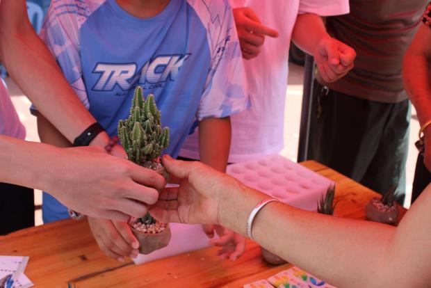 下午澳角的海风裹着咸湿掠过展台,阳光斜斜地淌过每件作品,“光合新生”义展在沙滩上支起一片绿意。展台上“旧塑焕新”的作品与浪影相映:塑料瓶裁拼成棱角分明的机器人,似在沙滩上守护绿意;莲花灯瓣叶间流转着金光;玻璃瓶打磨的花瓶盛着碎光;贝壳嵌边的相框框住海色,植物滴胶将花叶的鲜活凝作永恒,平展展铺在展台,叶影与枝痕在阳光下格外清晰;鲍鱼壳与黏土贝壳拼成的冰箱贴映着微光,黏土挂坠串起渔乡意趣,明信片上印着澳角特色,透卡、钥匙扣和种子纸书签藏着澳角的讯息——件件皆藏“变废为宝”的智慧,诉说着“珍惜资源、共护生态”的环保心语。