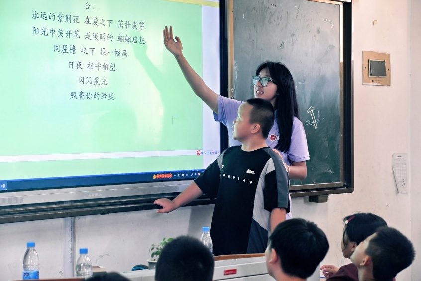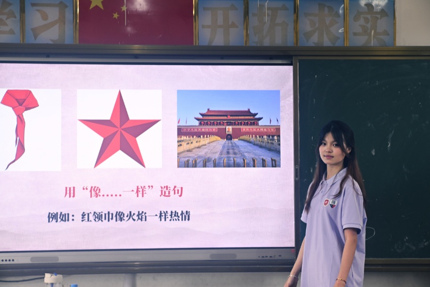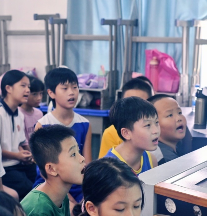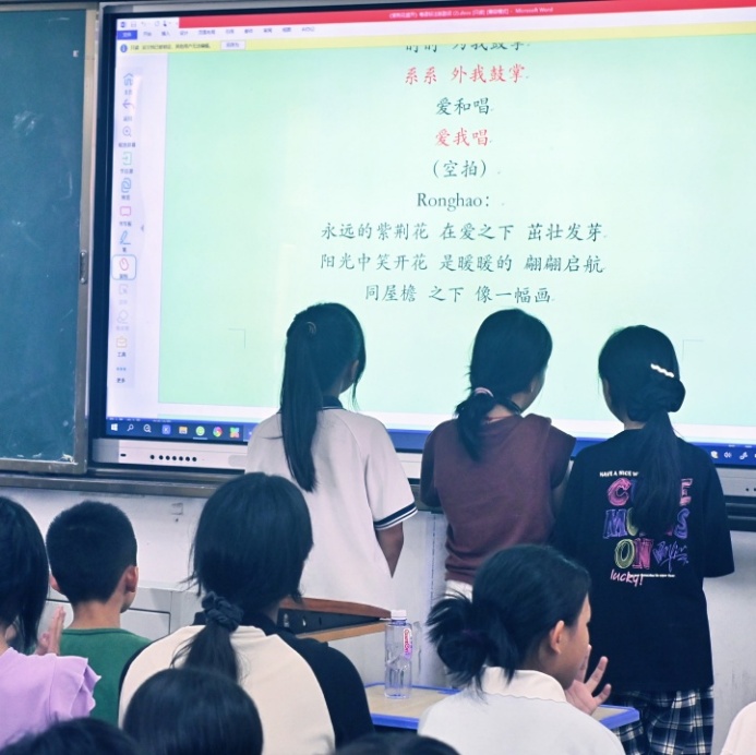 合唱课上,老师以分组比拼、登台展演为引,驱动孩子们主动钻研《紫荆花盛开》。从零散音节到和谐和声,童声在探索里愈发清亮,实践队员亦因这份音乐赋能,更笃定以艺术为桥、点亮童真的支教初心 。