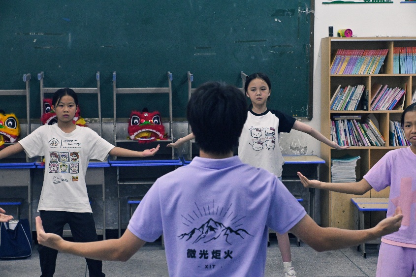 武术课上,实践队员专注传授精武门八极拳套路,带孩子们一招一式地演练。从生涩到连贯,借套路传承精武精神,让尚武品格悄然扎根,点燃对传统武学的向往。
