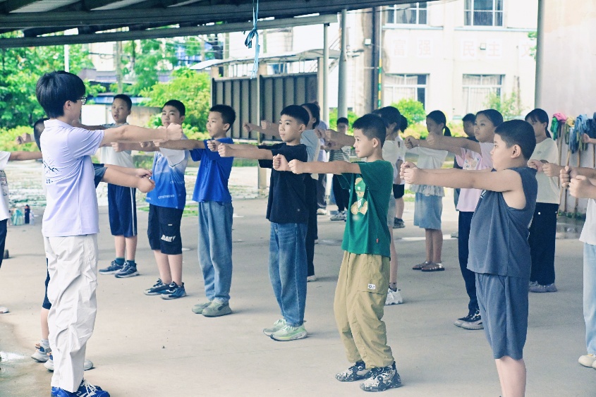本次武术课,孩子们跟随实践队员操练八极拳 。出拳刚劲有力,踢腿利落干脆,一招一式间,矫健身手渐成。拳脚起落里,不仅强了筋骨,更学会了守护自身的本领 。