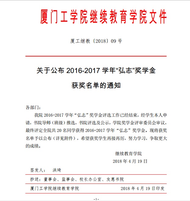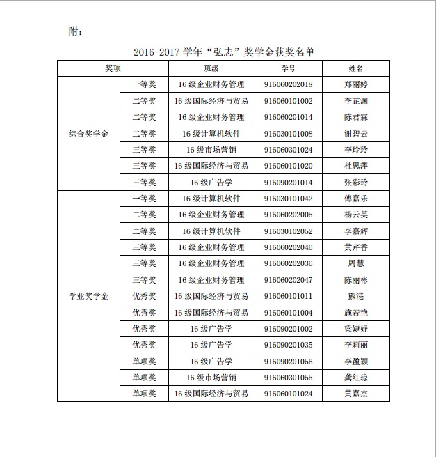 关于公布2016-2017学年“弘志”奖学金获奖名单的通知