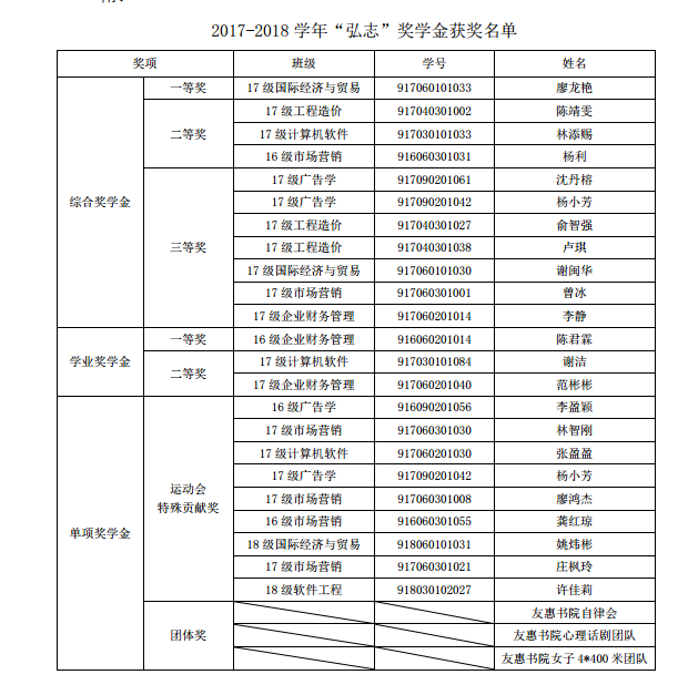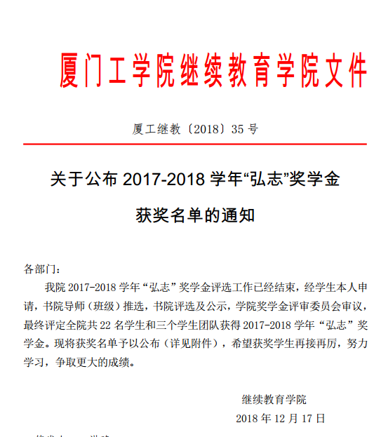 关于公布2017-2018学年“弘志”奖学金获奖名单的通知