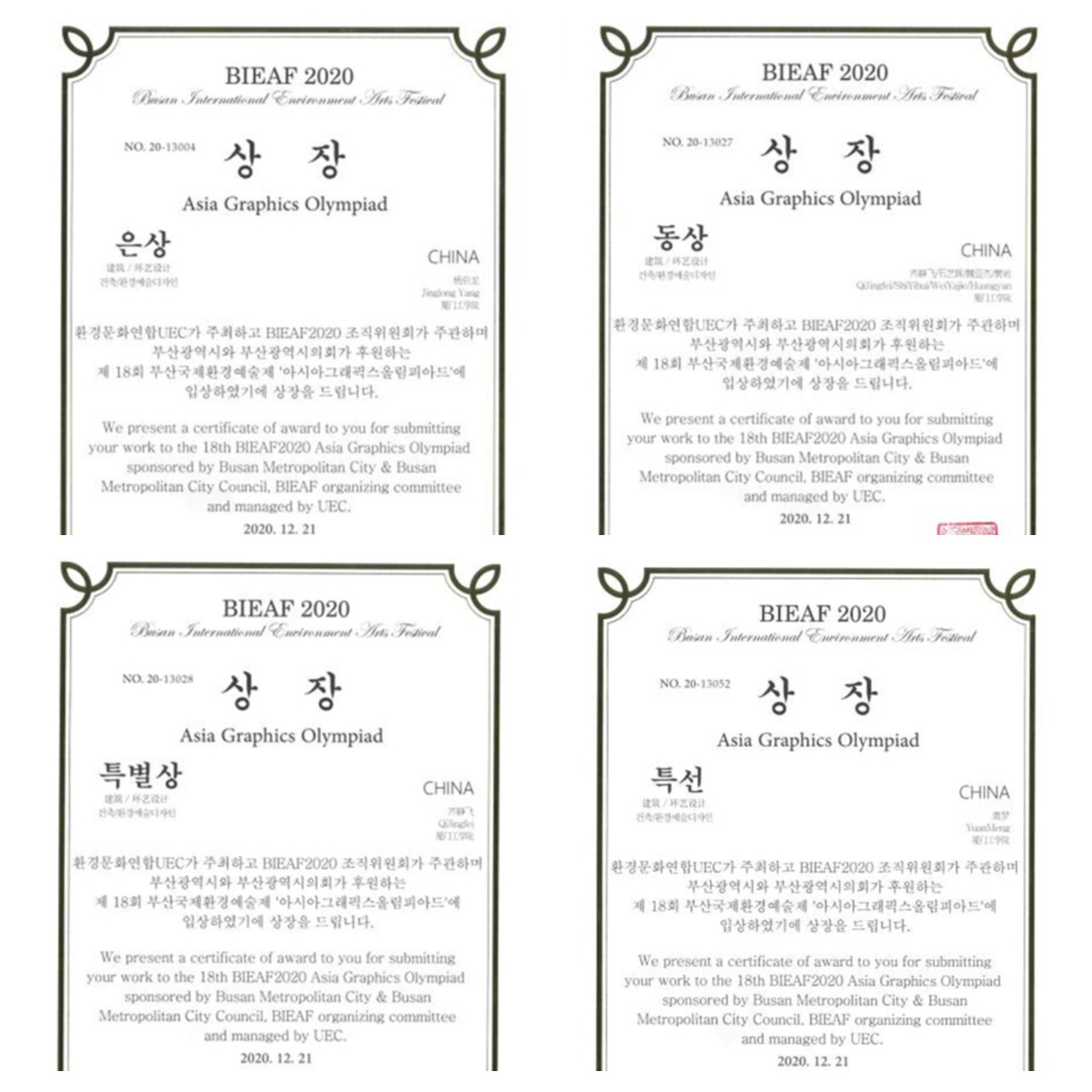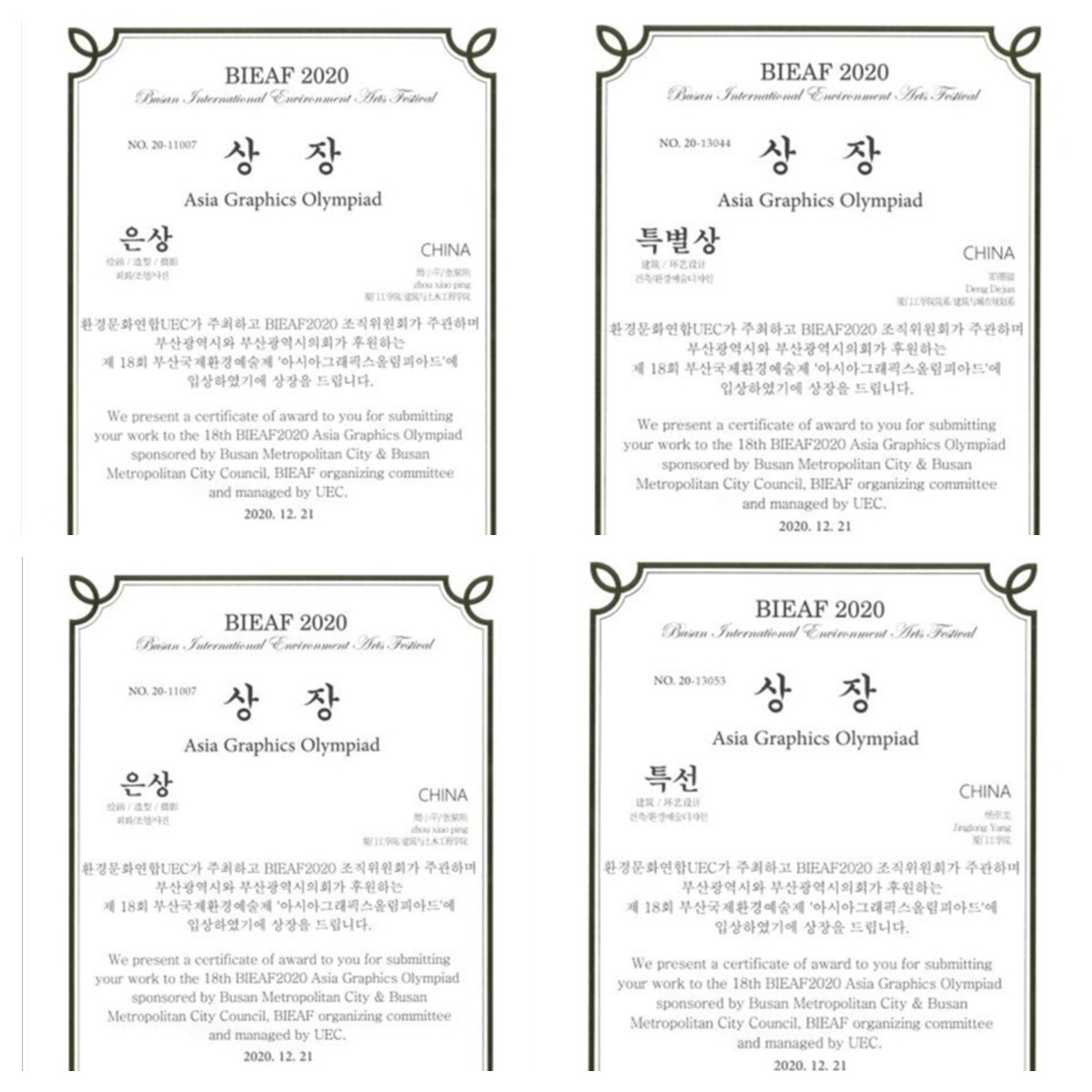 我院周小平老师作品《客家土楼组图》获得银奖,陈梦晓老师作品《宏村组图》获得铜奖,邓德俊老师作品《赣龙之竹影风荷》获得特别奖;我院学生杨京龙同学作品《多功能影剧院设计》获得银奖,齐静飞、石艺晖、魏亚杰、黄岩同学作品《窑望果乡》获得铜奖,齐静飞同学作品《山海同湾》获得特别奖,彭子萱同学作品《雅韵流觞》获得特别奖,袁梦同学作品《蓝色共生》获得特选,杨京龙同学作品《高层商业综合体建筑》获得特选。