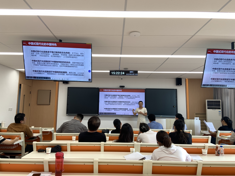 会上,雷雨、胡爱琴两位老师分别进行了片段教学展示。雷雨老师以《思想道德与法治》课程为依托,展示了《紧握艰苦奋斗接力棒,奋力奔跑绽放青春梦》《中国精神是兴国强国之魂》《伟大建党精神——百年大党的“青春密码”》三个不同主题的教学片段设计思路,结合丰富的教学案例讲解了艰苦奋斗、中国精神、建党精神的深刻内涵。胡爱琴老师选取了《习近平新时代中国特色社会主义思想概论》课程中《中国式现代化》《坚持以人民为中心》《全面深化改革开放》三个重点内容进行了片段展示,以问题链的方式展开教学环节,通过案例讲授、横向对比等方法层层推进理论阐述的深度与广度。