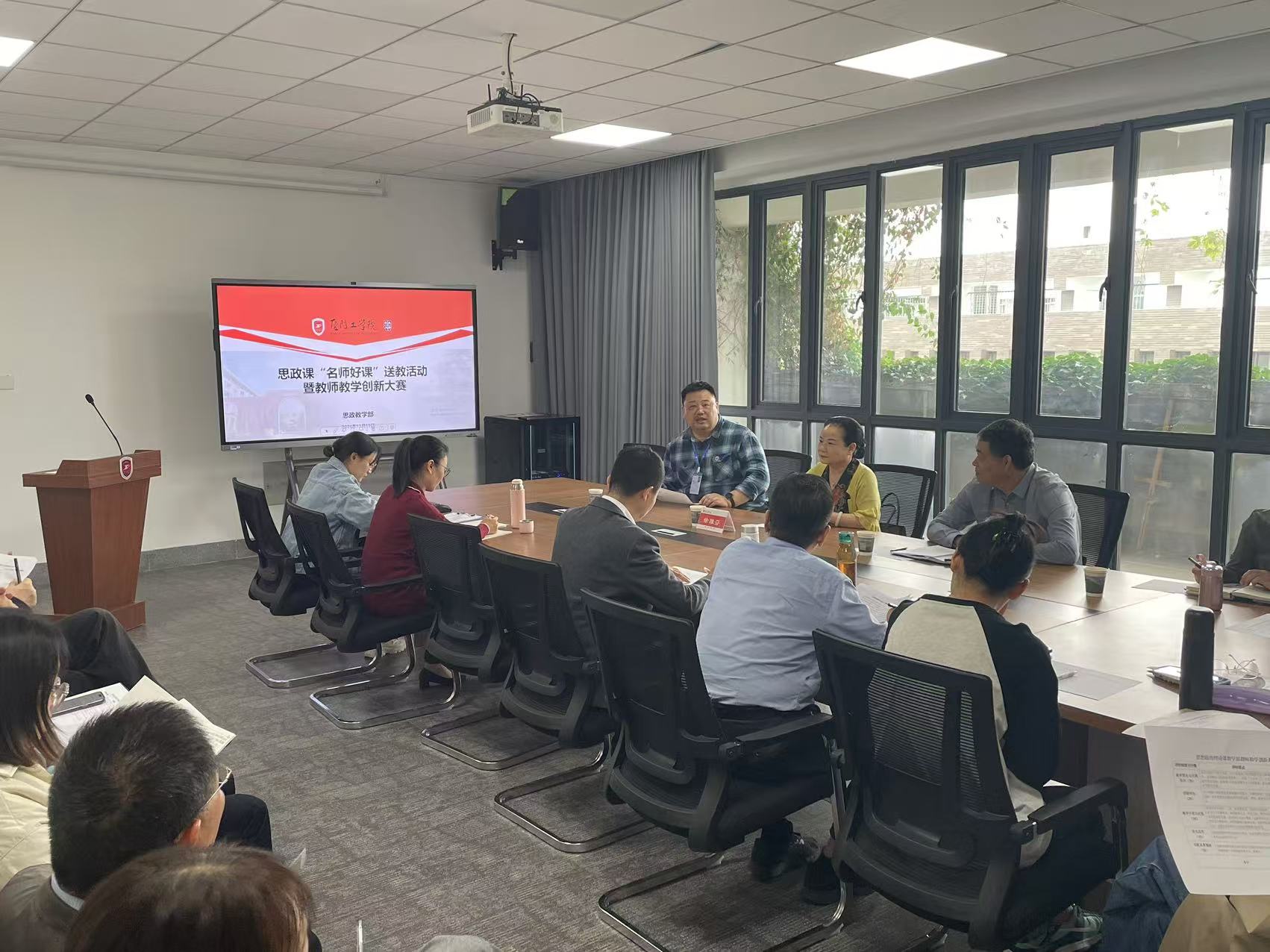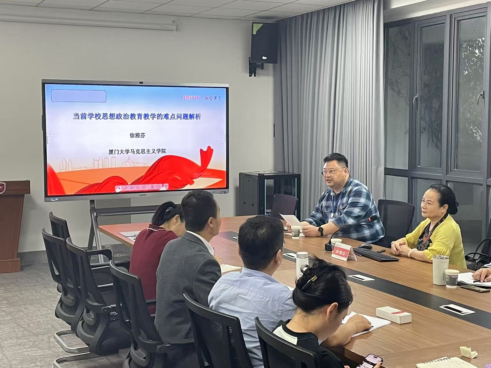 为深入学习贯彻习近平总书记关于学校思政课建设的重要指示精神和新时代学校思政课建设推进会精神,推动优质思政课教学资源共享,根据《福建省教育厅关于开展思政课“名师好课”送教活动通知》(闽教思[2024]17号)文件精神,11月19日下午,厦门大学马克思主义学院徐雅芬教授来到厦门工学院开展题为《当前学校思想政治教育教学的难点问题解析》的“名师好课”送教活动。活动开展前,课部娄红伟主任,向徐雅芬教授介绍了本单位的基本情况,并向徐老师表示热烈的欢迎和感谢!本次活动由思想政治理论课教学部副主任邵晴主持,课部全体教师参加。