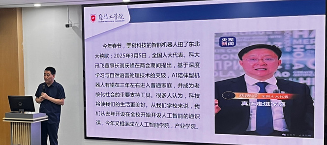 讲座伊始,娄红伟副教授以生动案例切入主题。他举例2025年春节宇树科技人形机器人表演东北大秧歌的趣闻,以及全国人大代表、科大讯飞董事长刘庆峰关于“AI陪伴型机器人即将进入普通家庭”的预测,直观展现了科技与日常生活的紧密关联。此外,他特别介绍了我校在科技教育领域的探索实践:学校于2024年开设了“人工智能通识课”,2025年成立厦门工学院人工智能产业学院,凸显学校紧跟科技前沿的办学思路。