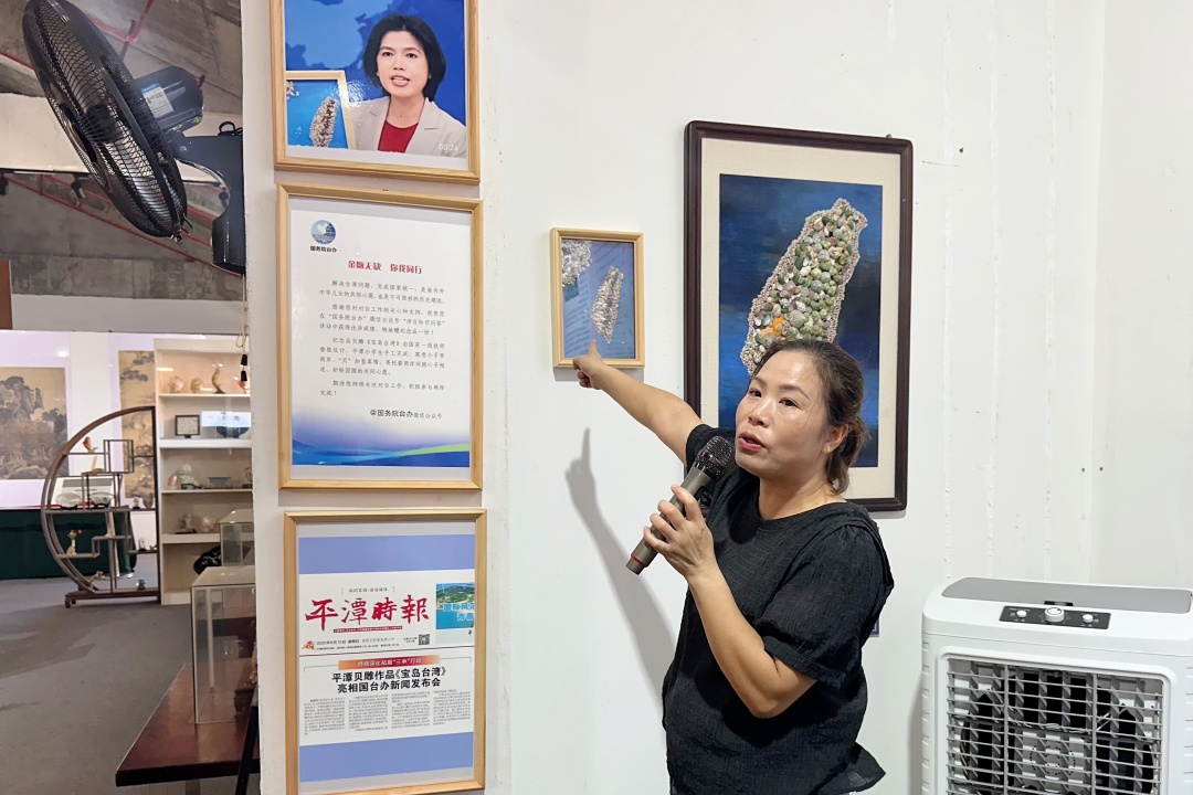 1955年,平潭实验小学林国钦老师开创性地以“贝壳堆画”为载体,创作以宝岛台湾为主题的艺术作品。6月11日,国台办新闻发言人朱凤莲手持平潭小朋友参与制作的贝雕作品《宝岛台湾》亮相,体现了“小手牵两岸、‘贝’加显真情”的寓意,生动诠释了两岸同胞心手相连、祈盼团圆的共同心愿。