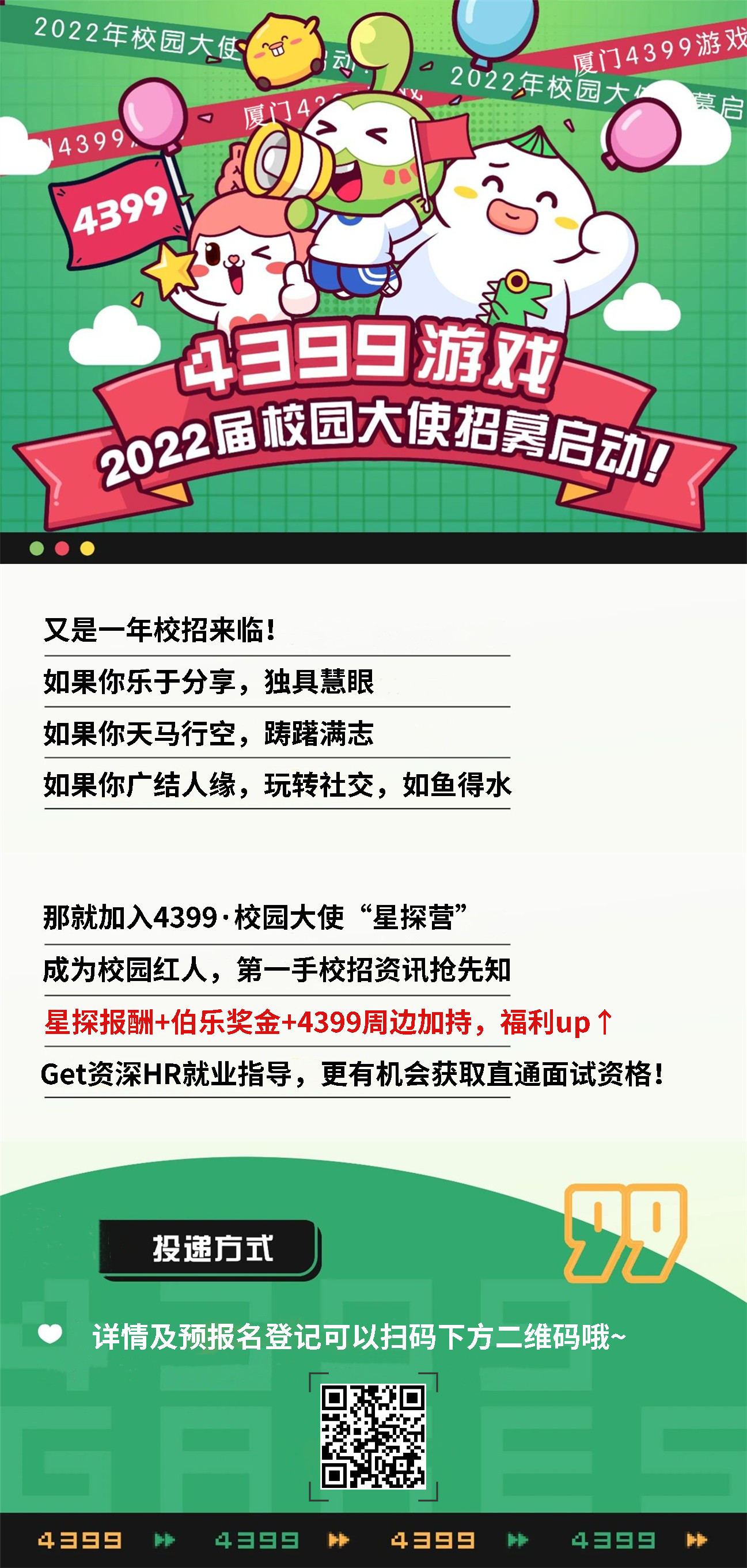 在线网申PC端:http://u.4399.com/hr 移动端:扫下文图中二维码或搜索“4399HR”小程序