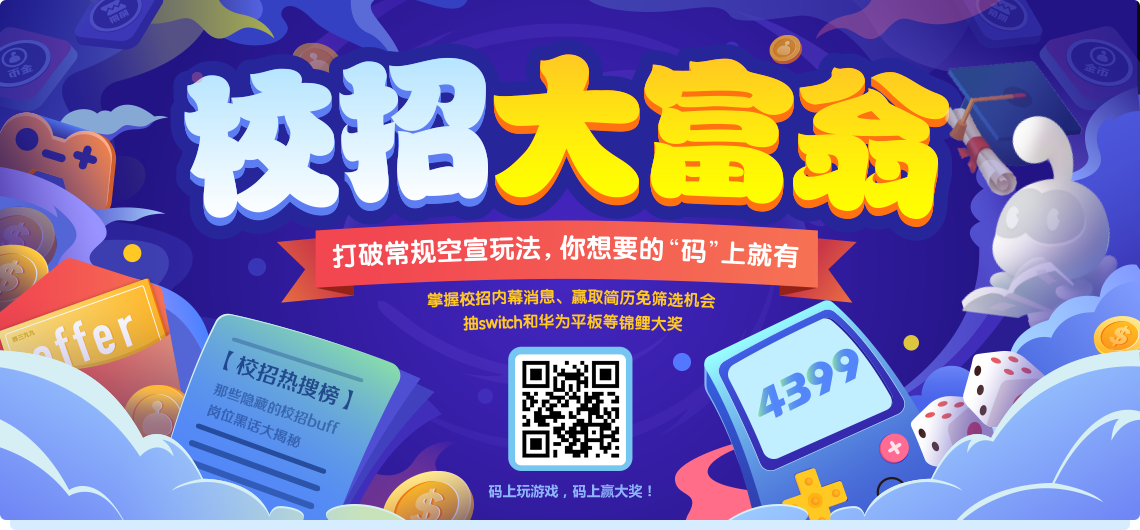 1、校招大富翁:校招主题游戏隆重登场,打破常规空宣玩法,帮你掌握校招内幕消息,赢取简历面筛选机会,抽switch话华为平板等锦鲤大奖