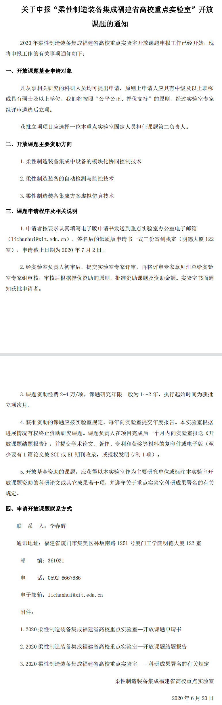 关于申报“柔性制造装备集成福建省高校重点实验室”开放课题的通知