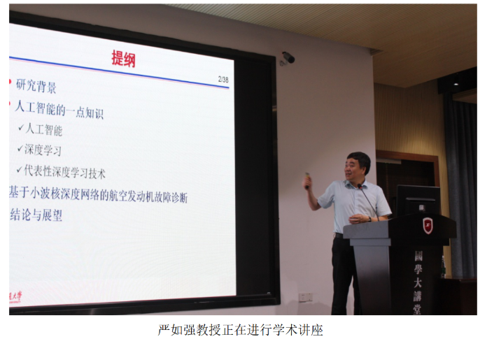 在讲座中,严如强教授结合丰富案例深入浅出地讲解了以深度学习为代表的新一代人工智能技术在特征挖掘、知识学习与智能程度等方面所表现出的显著优势,为有效的机械故障诊断提供了新途径。报告在介绍人工神经网络发展历史的基础上,引出深度学习的概念及特征,随后介绍几种典型的深度网络模型,特别是课题组最新构造的小波核深度网络模型及其在航空发动机故障诊断中的应用,最后给出了深度学习在今后的发展趋势。讲座的提问环节,严教授与在场师生进行了热烈得讨论,让大家对人工智能在机械故障诊断中的最新应用场景、用小波分析变换替代卷积神经网络和可解释性卷积神经网络等研究方向有了直观的理解。