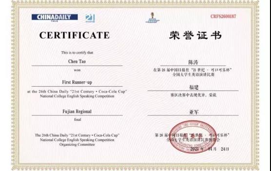 第26届中国日报社“21世纪可口可乐杯”全国大学生英语演讲比赛于2021年4月24日通过线上比赛方式进行。福建省赛区共有厦门大学、华侨大学、集美大学,福州大学,福州师范大学等共24所高校的学子报名参赛。