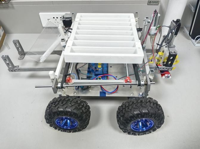 作品简介:全国大学生机械创新设计大赛获国家级银奖。基于STM32微处理器自动控制大大葱栽种小车的自主行走,并在行走过程中进行自动开沟、种苗、回土、施肥、浇水、笼土、压土等工作的流程,使小车实现自动栽种大葱的全过程。
