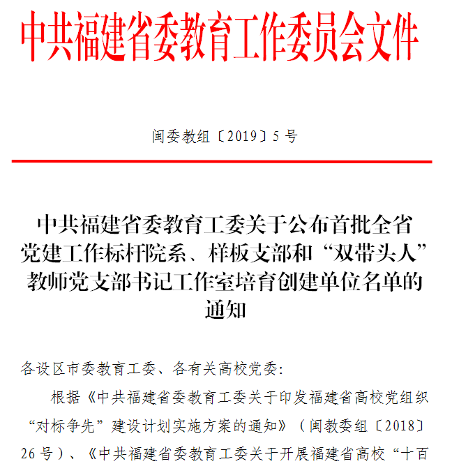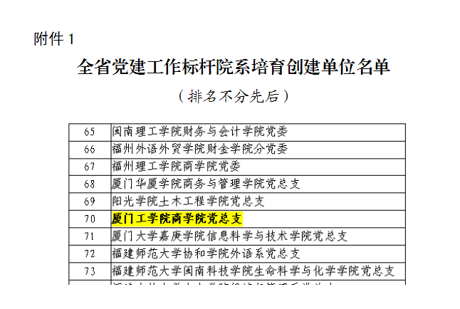 厦门工学院商学院党总支经校党委推荐、省委教育工委评审,荣获首批全省党建工作标杆院系。特此喜报。