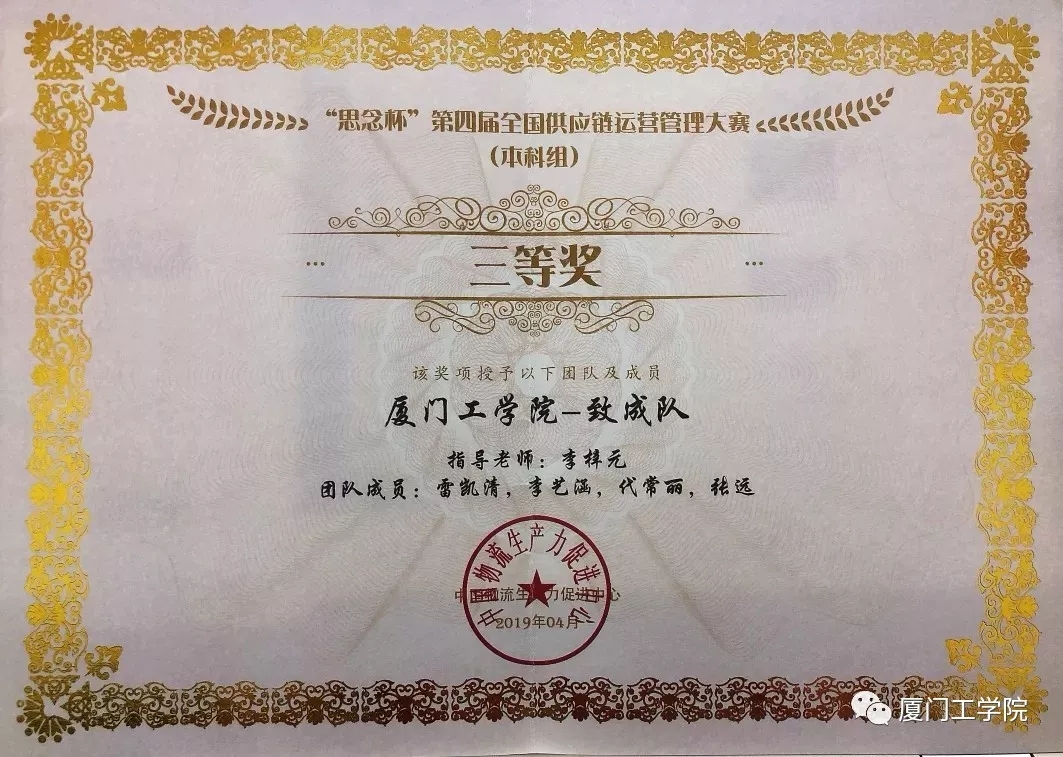 2019年4月27日至28日,由中国物流生产力促进中心主办,青岛农业大学、中国管理科学学会供应链与物流管理专业委员会承办的第四届全国供应链运营管理大赛在青岛农业大学举行。本次竞赛吸引了天津大学、北京化工大学、广州大学、深圳大学、集美大学、福州大学、长春大学、华南师范大学等156所全国高校的本科生相互切磋、同场竞技。由商学院管理系系主任李梓元老师带领的四名同学(张远、雷凯清、李艺涵、代常丽)组成的致成队,经过四场激烈角逐的模拟实战,最终从149支参赛队伍脱颖而出,荣获第四届全国供应链运营管理大赛三等奖!