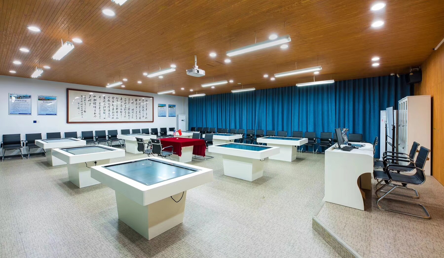 商务综合实训室面积110平米,配备8个多点触摸屏控制系统和1张谈判桌。主要以国际贸易经营沙盘教学软件为平台,作为培养国际贸易综合能力的校内实训基地,可开展国际贸易进出口业务仿真操作、国际商务函电与单证处理、国际商务礼仪培训等。商务综合实训室也是国际贸易经营实战沙盘竞赛、电子商务“三创”赛、全国市场营销大赛和各项团队竞赛的集训场所。