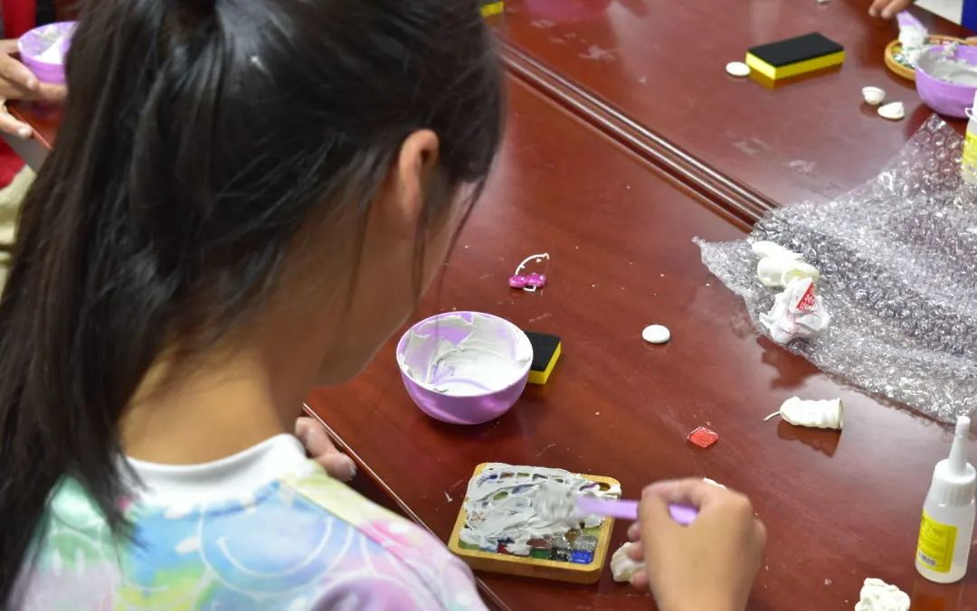 首先,主讲老师厦门工学院商学院大学生志愿服务队成员王楚楚向小朋友们展示本节课所需要的材料以及该如何使用便开始动手了。小朋友们先把自己喜欢的图案摆出来,再在木板上涂上胶水,再等待一段时间,胶水干后可以在木板上涂填缝剂。一系列制作完成后,小朋友们可以带着自己的专属杯垫回家啦。