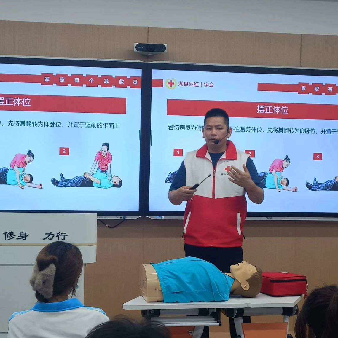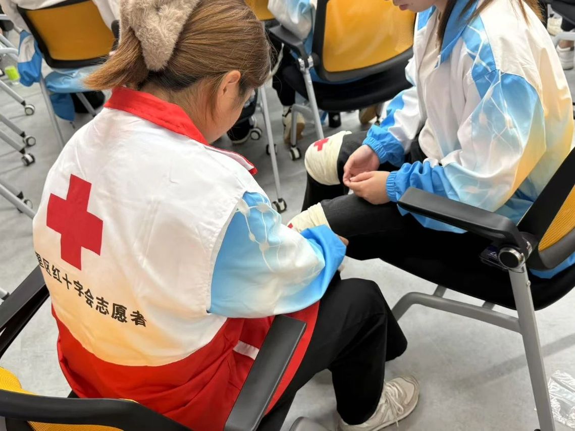 活动伊始,湖里区红十字会老师深入阐述了红十字精神的核心内涵,为整场培训奠定了人道、奉献的精神基调。随后,围绕急救核心技能展开教学。在心肺复苏环节,老师细致讲解了心肺复苏的知识要点与操作规范,从判断患者意识、呼吸,到胸外按压的位置、频率、深度,再到人工呼吸的正确方式,均进行了全面且专业的说明。同学们全神贯注聆听,认真记录关键内容,并在老师的悉心指导下,积极投入到心肺复苏实操训练中,将理论知识切实转化为实践技能。