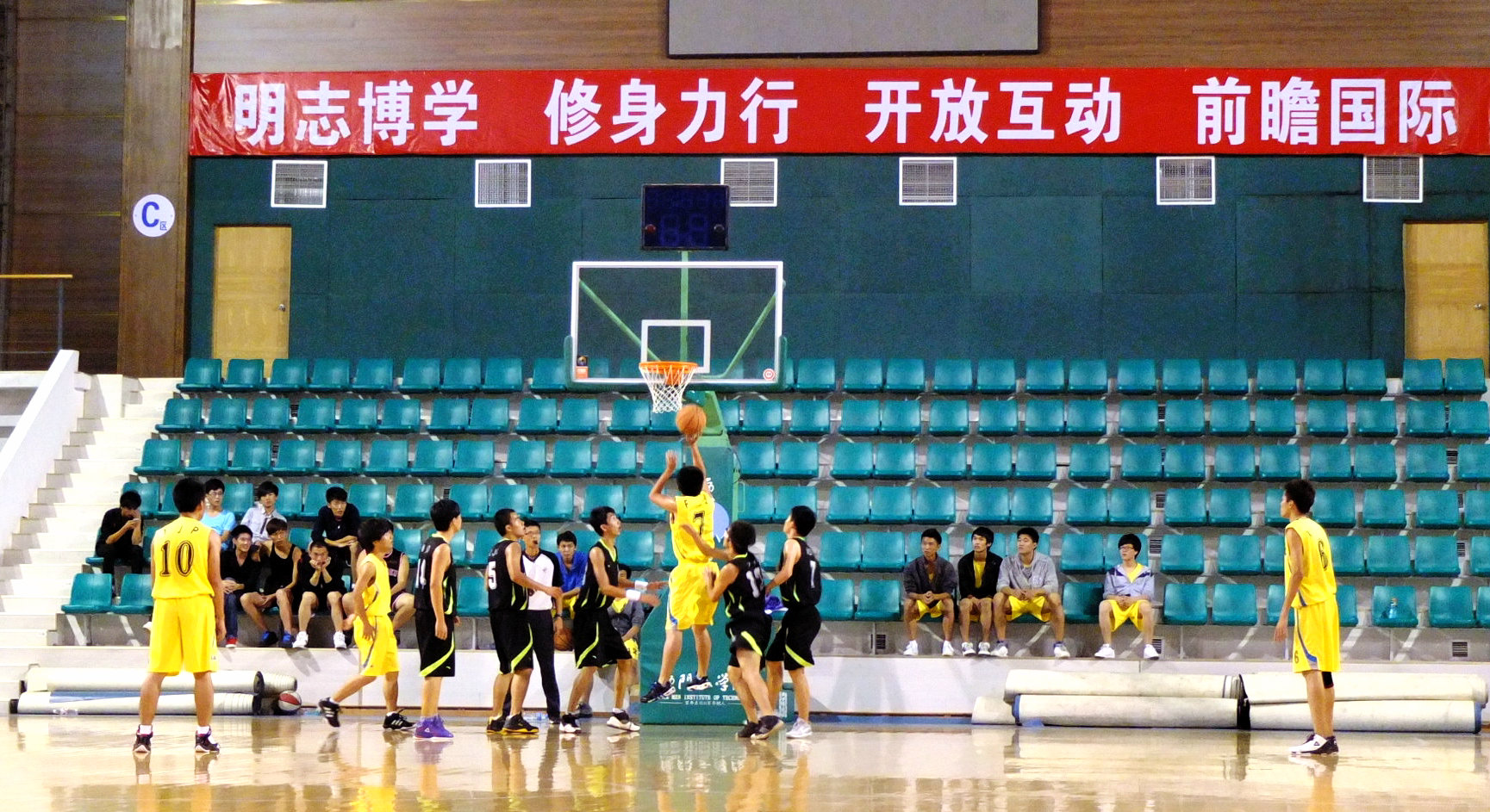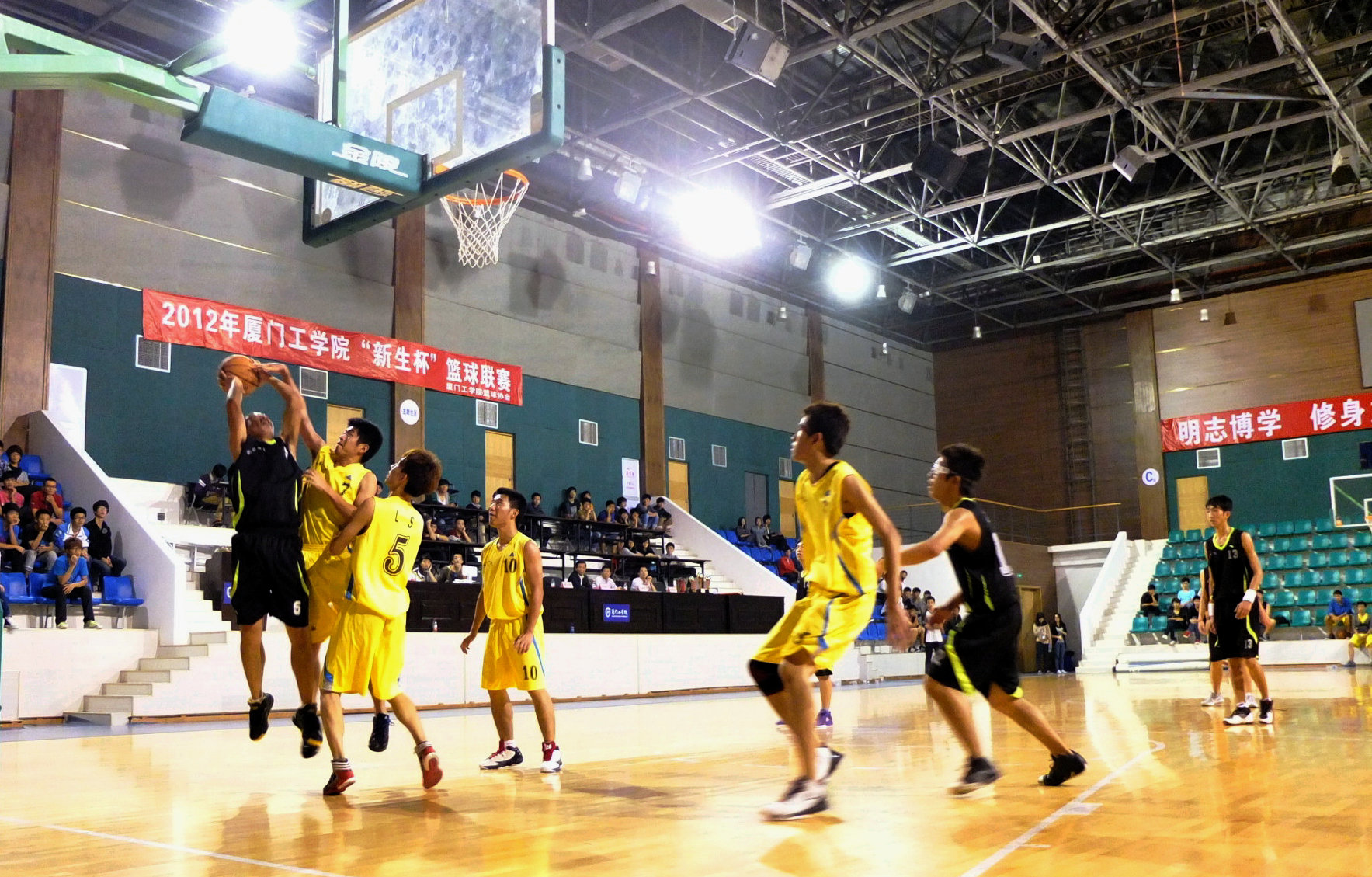 今夜的篮球馆热情高涨。随着主裁判一声长哨吹响,分别代表友善书院的土木1队和友恭书院的机械1队开始了荣誉之战。友善书院土木1队斗志昂扬,奔跑跳跃、抱球转身、突破内线、快速扣篮,迎来了友善书院的开门红,顿时引爆观众们的热情,啦啦队员的加油声一浪高过一浪。机械1队也毫不示弱,传球、投篮、积极反攻,两队打得异常激烈。