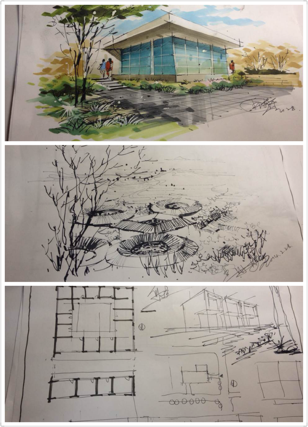 周艺川老师首先以诙谐的开场邀请众老师上台与同学们交流。叶茂乐老师别开生面的谈吐以及独特的语言魅力赢得了在座老师同学们的不断喝彩。他的现场示范,钢笔线条挺拔、刚劲有力,马克笔的运用更是娴熟无比,也验证了丰富的考察调研写生经验的重要性。而易成海老师同是现场考察的实践者,其拿出了个人在设计历程中的独特体会及手绘在专业上的运用技巧和同学们分享。易老师现场绘制了一幅福建传统民居土楼向同学指明设计与手绘不可分家。快题能手何小立老师也为考研的同学们讲述了快题技巧和考研的见解。此次讲座还有抽奖环节,为同学送上免费的专业书籍。最后在周艺川老师的总结下本次讲座圆满结束
