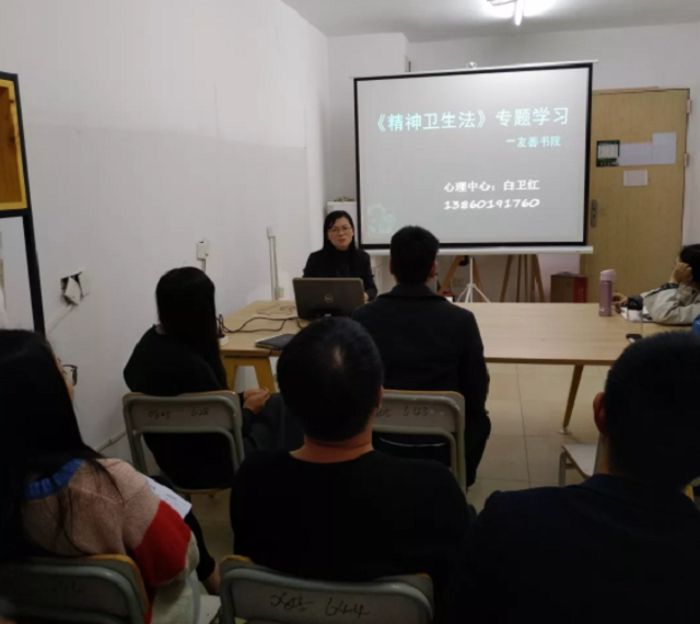 近日,心理咨询中心白卫红老师于2018年11月26日上午9点30分,到友善书院给书院全体专职导师讲解新版《精神卫生法》,学习会在书院会议室友善207召开,友善书院全体专职导师参加。