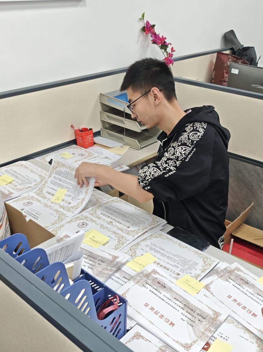 在学院办公室内,另一批学生党员和入党积极分子组成的志愿服务队也在为毕业生保驾护航。为确保”毕业证、学位证、诚信荣誉证书、毕业生鉴定报告”四证发放工作零差错,他们提前整理核对信息,制定细致的发放流程,确保每一份证书都能准确无误地发送到毕业生手上。