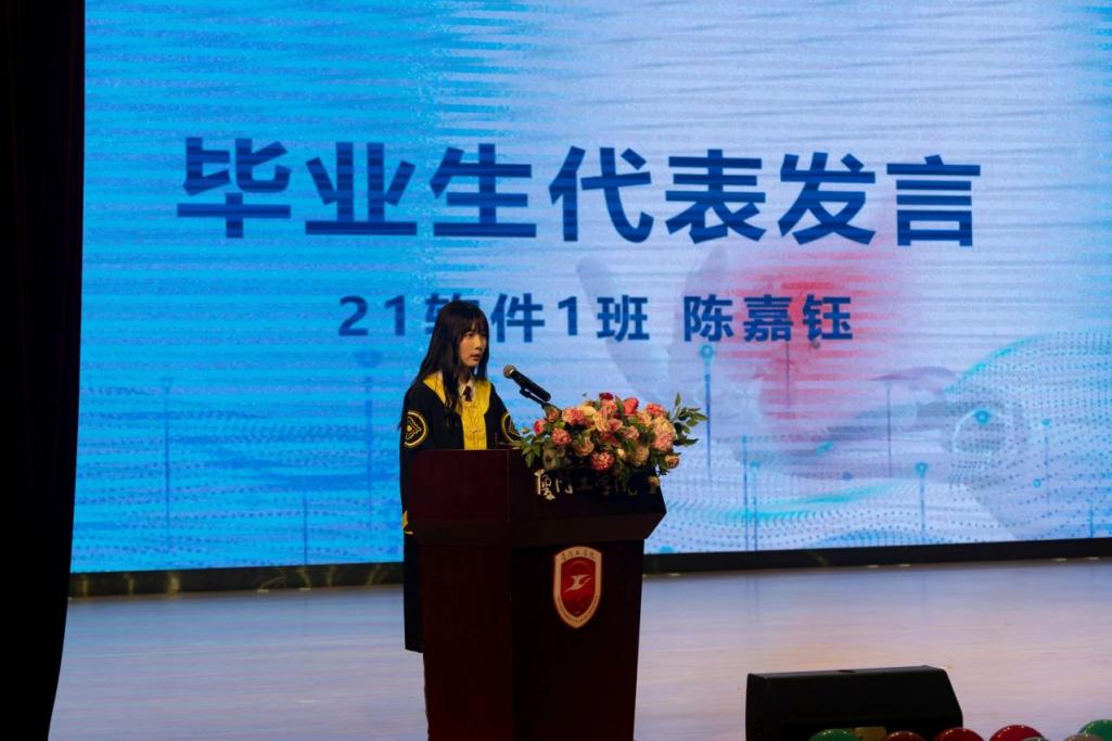 毕业生代表陈嘉钰踏上舞台,用青春视角,讲述校园奋斗、成长感悟,分享独家记忆,让同窗们共情那段一起拼搏的时光 。