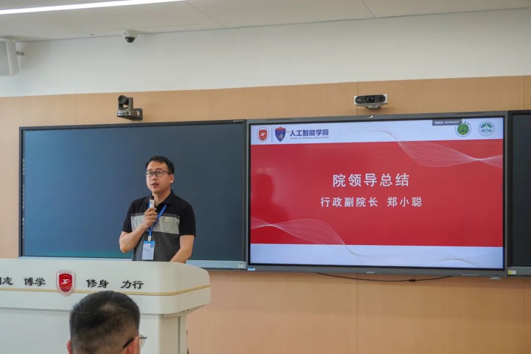 由主持人程钰淇向大家介绍会议流程以及参与本次会议的领导和老师,分别是人工智能学院行政副院长郑小聪老师、人工智能学院办公室副主任苏向荣老师,人工智能学院分团委书记林逸简老师。