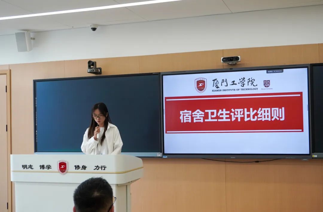 纪律督导部副部长甘熳灵同学向参会同学们深入地解读了宿舍卫生评比细则,通过列出具体地扣分点,旨在于让同学们明晰卫生标准。在最后指出违规违纪情况及其危害后,她强调同学们应遵守规定,不抱有侥幸心理。宿舍卫生是一项需要全体同学共同维护,长期坚持的工作,每一位同学都应该相互监督提醒,共同营造良好的卫生情况。
