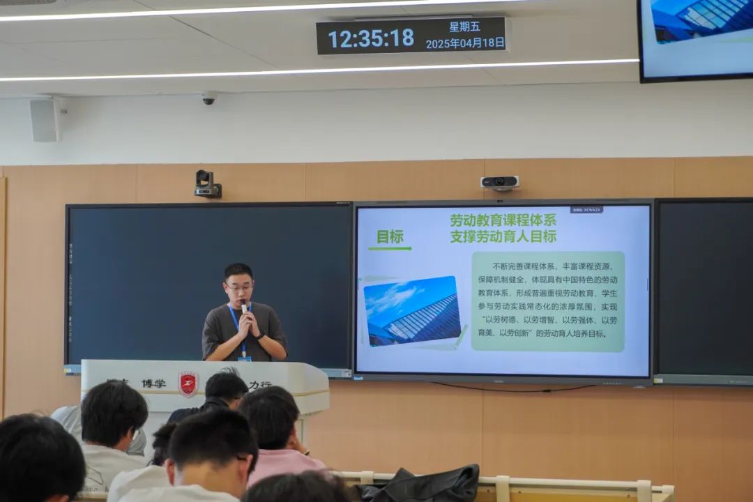林逸简分团委书记向大家介绍我校大学生劳动教育实施方案,以“立德树人,以文化人”为主线,构建课程+实践+文化育人体系。通过开设劳动必修课程、建设校内外实践基地、开展志愿服务等活动,强化劳动价值观培育与技能培养结合,传统劳动与现代科技融合,个人体验与集体协作并重。建立多元评价机制,将劳动素养纳入综合素质测评,推动劳动教育长效化、制度化。旨在培养学生正确劳动观念、基础劳动技能及创新实践能力,促进德智体美劳全面发展。