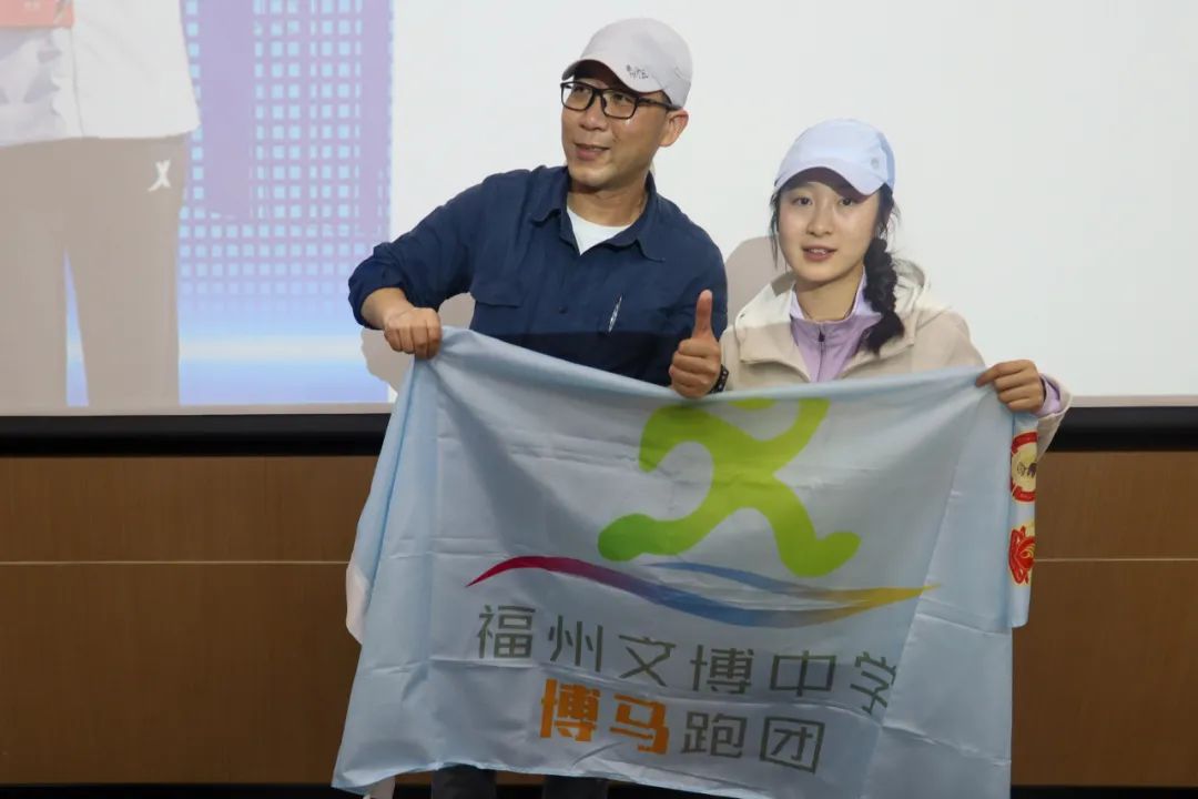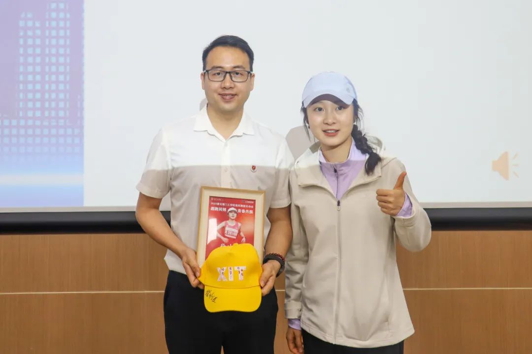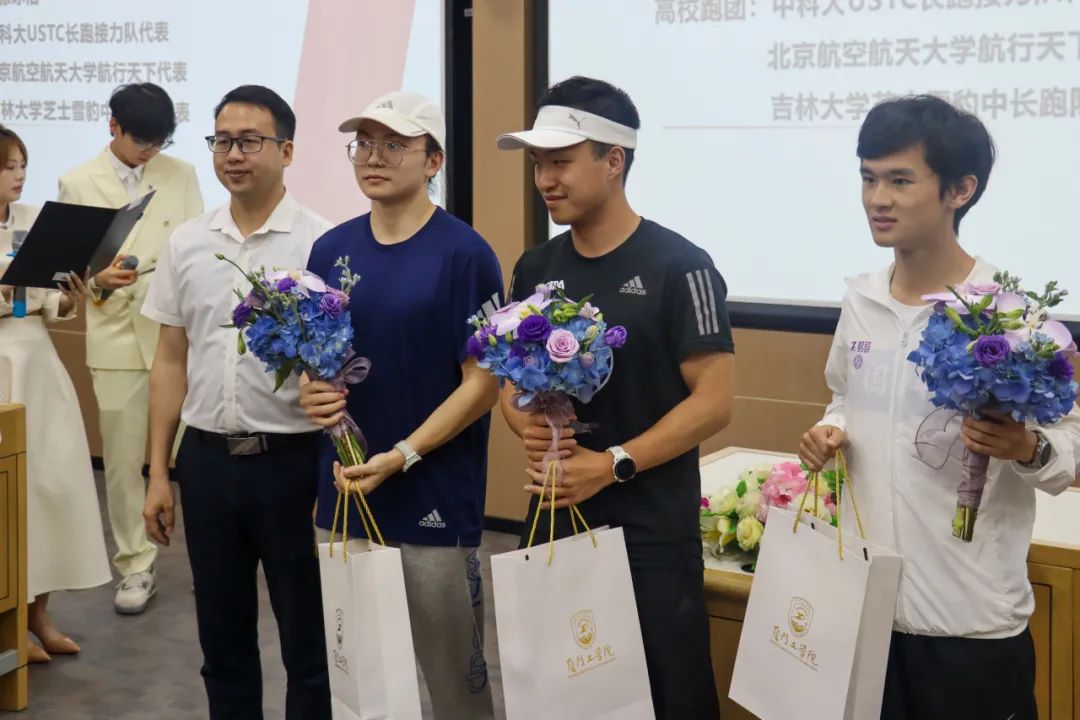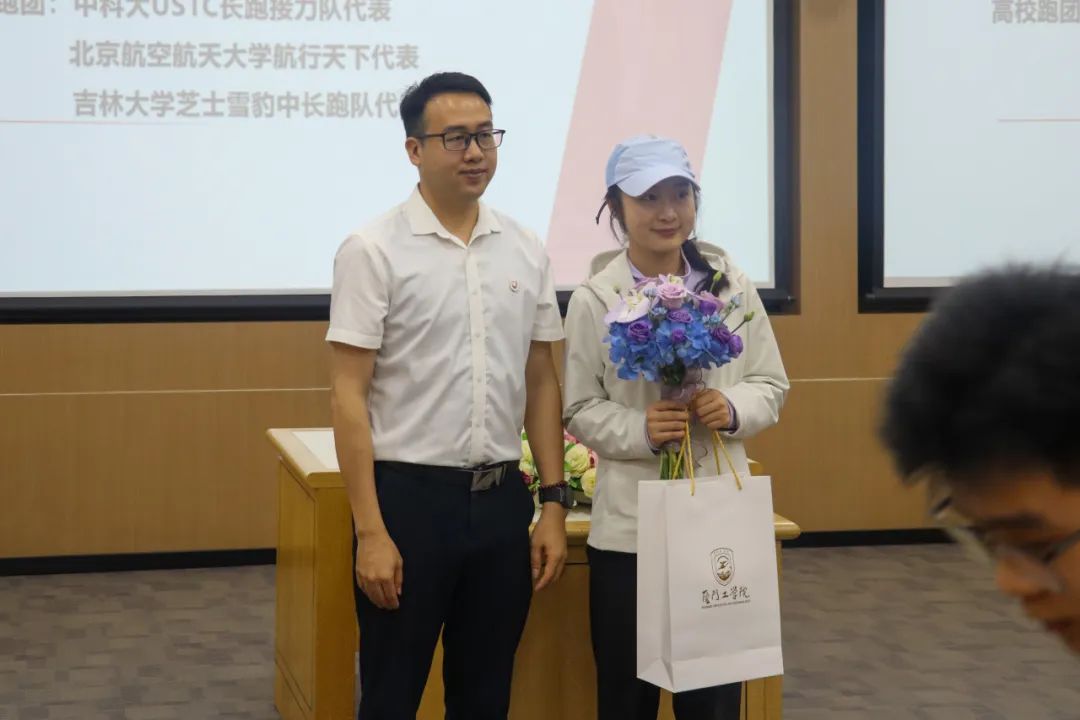 活动第七项环节,由人工智能学院行政副院长郑小聪为冠军选手徐冰洁女士及高校跑团代表们送礼,这份礼物,不仅是一种象征,更是双方深厚情谊的见证。它承载着对运动的热爱,对未来的期许,让这场交流更加温暖而难忘,祝愿他们在未来的征程中,如疾风般驰骋,不断超越,再创佳绩!