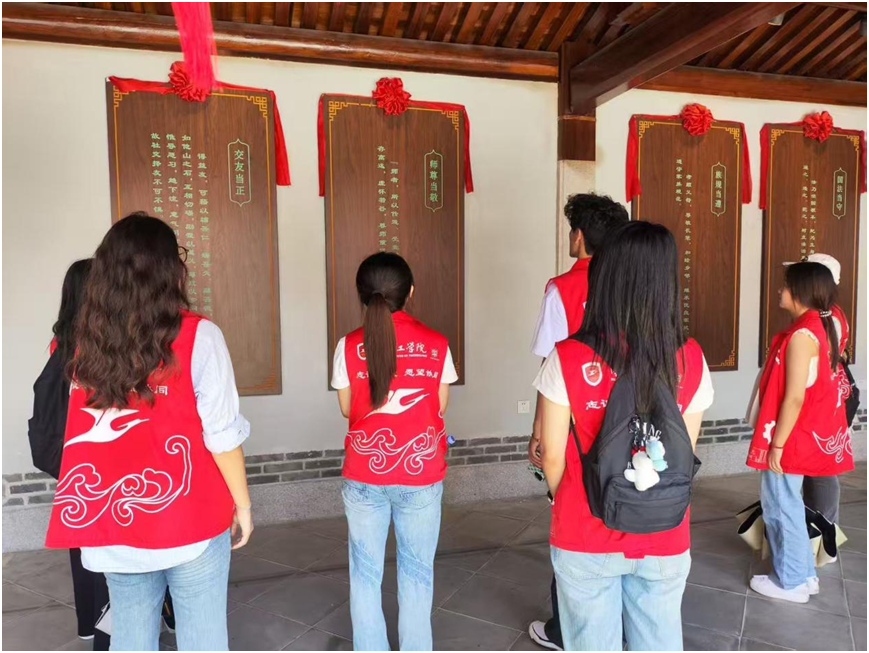实践队的寻源之路,从“天妃故里”牌坊下的驻足开始。阳光下,队员们身着的红马甲与古色古香的石坊相映成趣,青春的朝气与历史的沉淀在此刻交融。大家纷纷举起相机,将这抹独特的色彩定格——既是对实践之行的纪念,也是年轻一代与传统文化的一次郑重对话。