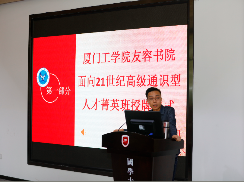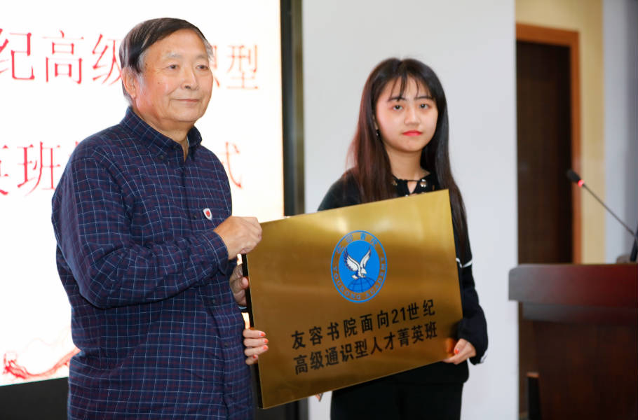 接下来是授旗授牌仪式,党委书记林建华教授为人才菁英班第一届班主任陈平民老师授予人才菁英班班旗,友容书院院长李子芳教授为菁英班第一届班长黄茵茵同学授人才菁英班牌匾,体现了友容书院对学生全面发展的高度重视。
